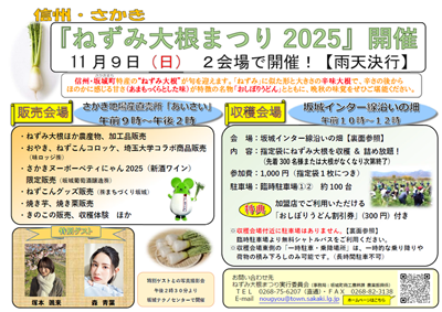 坂城町特産の「ねずみ大根」の収穫祭である『ねずみ大根まつり2025』を11月9日(日)に開催いたします。