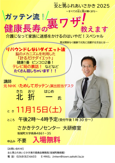 今回はNHK放送局で身近な話題をテーマとして最新の科学・技術をもとに解明する人気番組だった「ためしてガッテン」の専任ディレクターの北折一さんをお招きして、健康や長寿のコツ、地域での活動などについて講演していただきます。皆さんお誘い合わせてお出掛けください。