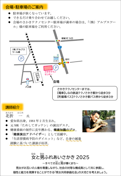 『すべての女(ひと)と男(ひと)がかがやく町』となるよう、健康や社会参加などをテーマに「女と男ふれあいさかき2025」を11月15日(土)午後2時から開催します。