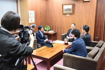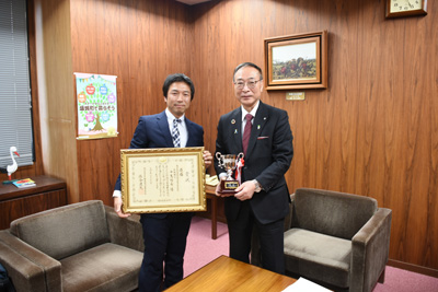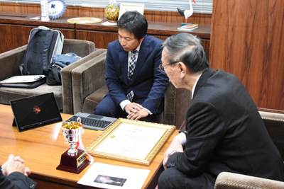 11月21日(金)、「坂城煙火」代表の中嶌結希さんが山村町長に、10月26日(日)に開催された「全国新作花火チャレンジカップ2025」において、優勝した報告をしました。