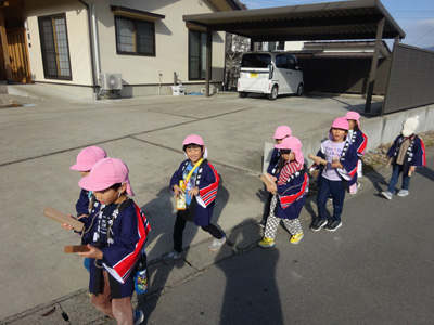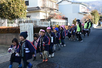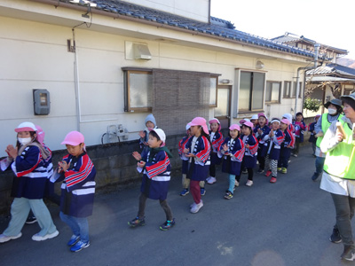保育園では火災予防学習、火災予防に関する広報活動などを通じて、幼年期から火に対する正しい知識を身につかることを目的に幼年消防クラブを結成し、そのクラブ活動の一環として、お散歩の際に、園児(先生)が拍子木を叩きながら、元気よく「火の用心」と大きな声を出して、町内のみなさんに火災予防を行いました。