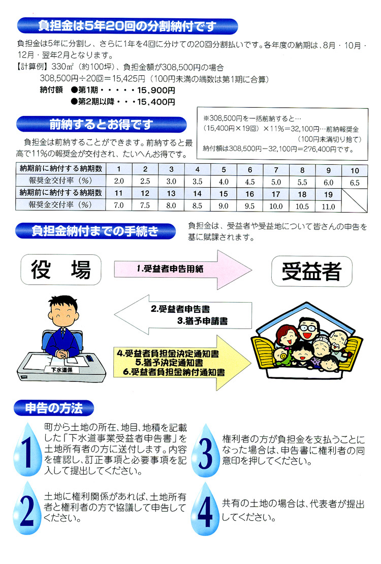 - 下水道は、生活環境や地域環境の向上に大きな役割を果たし、快適性や利便性、資産価値を高めますが、その整備には多額の費用と長い時間がかかります。そこで、下水道の整備により受益を受ける方に下水道建設費の一部をご負担いただき、国の補助金や皆さんからの税金とともに下水道の一層の整備促進を図るための貴重な財源に役立てるのが「受益者負担金制度」です。また、これにより下水道の整備計画のない地域の方との負担の公平も図れます。