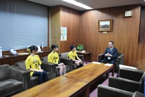 お越しになったのは、塚田翔太さん、小林姫咲さん、佐藤琉乙さん、森恵莉奈さんの4名で、3月1日(日)に東御市で開催された「春の北信越ドッジボール大会」でベスト4の好成績を収めた村上ドッジを代表した表敬訪問となりました。