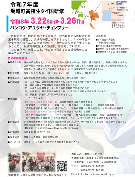坂城町在住の高校生または坂城町の高校へ通う高校生を対象に「坂城町タイ国研修事業」の参加者を募集します。この研修は、将来の坂城町を支えていく高校生に、タイ国で活躍する町内企業の視察のほか、現地学生との交流や歴史・文化などの異文化体験を通じて国際感覚を養い、坂城町、さらには日本を再認識するとともに、将来の展望を考える機会とするため実施するものです。