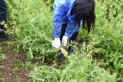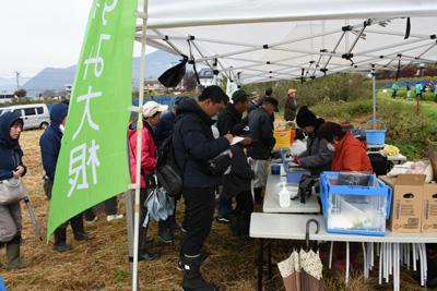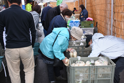 大根収穫会場には、収穫開始前から多くの皆さんが集まってきており、収穫開始になるのを今か今かと待っていました。そして、収穫開始の宣言がなされると、皆さんお目当ての大根を目指して畑の中に広がって、次々に袋の中に詰めていました。