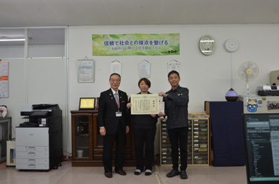 表彰は山村町長が各事業所を訪問して直接対象の従業員の皆さんに表彰状等をお渡ししました。