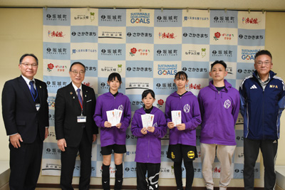 ▲(左から順に)塚田教育長、山村町長、佐藤琉乙さん、小宮山來実さん、小林姫咲さん、髙井協会長