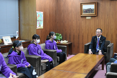 3人は、町長に対し、一人ひとり抱負をお話しし、「体調管理をして、精一杯頑張ってください」と町長から激励のお言葉をいただいていました。