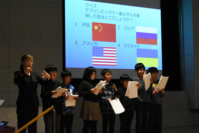 集会では、はじめに、坂城小学校4年生の家﨑舞子さん、金澤悠輝さん、小宮山慎也さん、中村奏叶さん、宮崎蒼詩さん、宮下駿太郎さん、栁澤大輝さん、山﨑皓介さんによる人権学習活動について手話と字幕つきで発表され、会場者へのクイズ問題もありました。