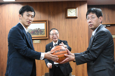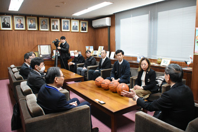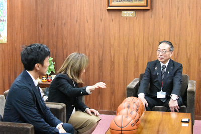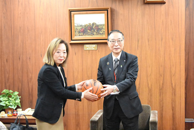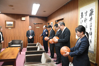12月11日(木)力石化工株式会社の代表取締役佐藤洋子様、専務取締役佐藤賢太朗様が来庁され、町内小中学校の児童、生徒さんのためにバスケットボール(40個)のご寄附をいただきました。