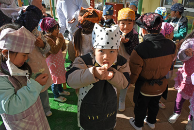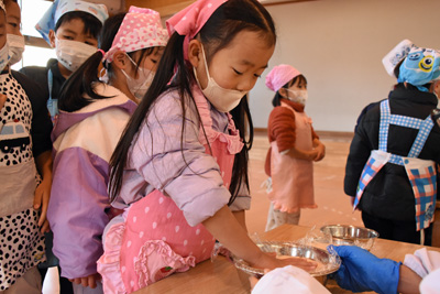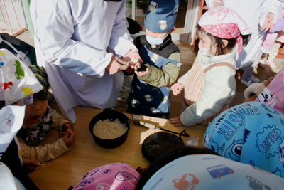 ついた餅は鏡餅にして、保育園の新年を迎えます。園児たちは、形のきれいな鏡餅になるように、みんなで形を整えていました。