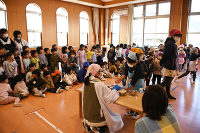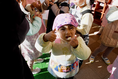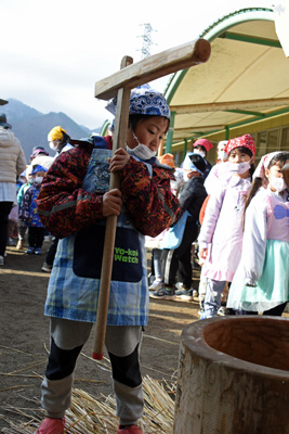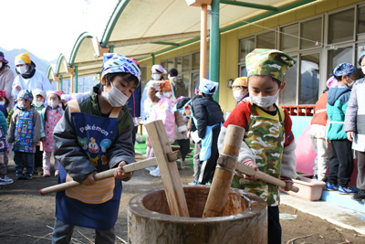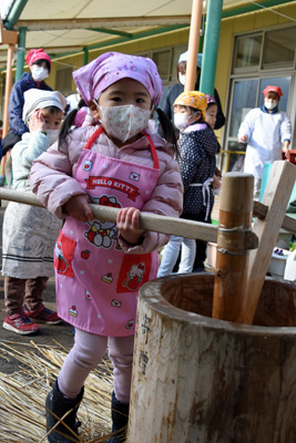 蒸し上がったもち米を臼に移して、(移す前に園児たちが試食)もち米を潰し、先生がつき始めると、臼の周りにいる園児たちから力強い「よいしょぉー!よいしょぉー!!」という掛け声が先生に贈られていました。ある程度、餅になってきたところで、今度は園児たちの出番です!各クラスごと2人一組になって順番に杵を振り下ろしていきます。