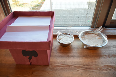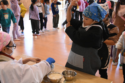 鏡餅を作っている様子(年長さんが作っている姿を年中さんと年少さんが真剣に見てました。)