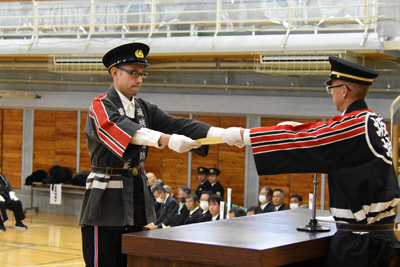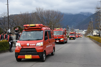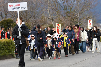また、消防団員の士気高揚と防災意識の向上を目的に、規律ある行進が行われ、幼年消防クラブは、「火の用心」と大きな声で地域の防災を呼び掛けました。