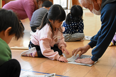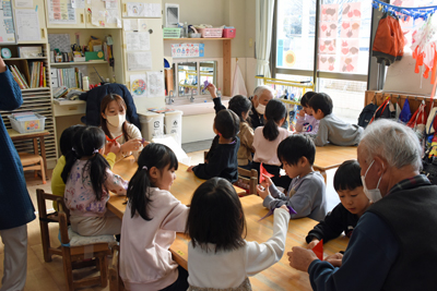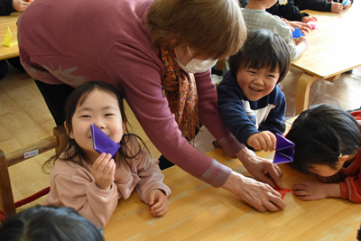 1月29日(木)、坂城保育園で、ボランティア団体のシャンテローズの皆さんによる折り紙教室が開かれました。