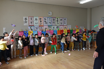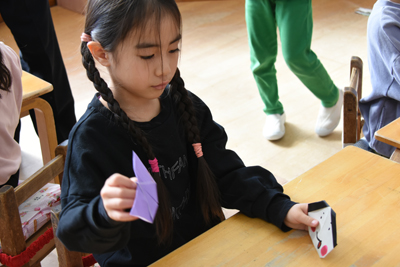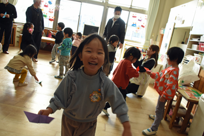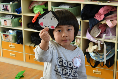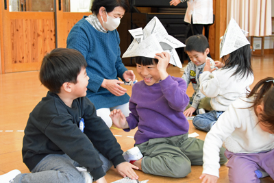 この日は、年少さんは「ひらひらちょうちょう」を、年中さんは「兜」を、年長さんは「ひらひらちょうちょうと福の神」を作りました。子どもたちは、自分の好きな色の色紙を使ったり、大きな新聞紙を使って、かっこいい「兜」やひらひらきれいに舞う「ひらひらちょうちょ」を真剣に、楽しく折っていました。児童は、「楽しかった。」「折るのが大変だったけどかっこいいのが折れた。」と言っていました。