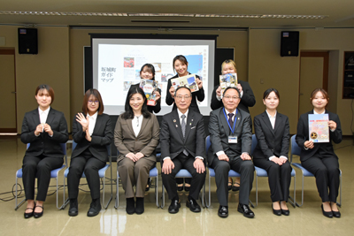 当日来庁した7名は、6名が県外出身者で、1名も町外出身者であり、発表した動画やキーホルダー、スマホグリップは、「坂城町」と初めて出会った瑞々しい世代の視点が存分に発揮されたものばかりで、町長はじめ教育長などはひとつひとつに感心しており、町長からは「素晴らしい作品で、チラシもきれいな写真とバーコードを使ったりとすばらしいアイデアでした。これらを有効に活用していきたい。」と学生たちに感想を伝えていました。一方学生からは、「取材をしている中で、町民の方々が温かく受け入れてくれて嬉しかった」「勉強だけでは得られない体験ができた。」などの感想がありました。