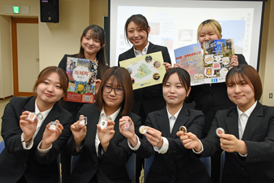 長野県立大学 グローバルマネジメント学部 二本松泰子教授のゼミ「発信力ゼミⅡ5組」の1年生9名は、「坂城町と村上義清公」をテーマに地域活性化の学習を進めてきました。実地踏査を行うなどして、具体的に活性化につながるための情報発信として、動画やキーホルダー、スマホグリップを制作しました。その報告会が2月5日(木)、町長、教育長などが出席し役場で行われました。
