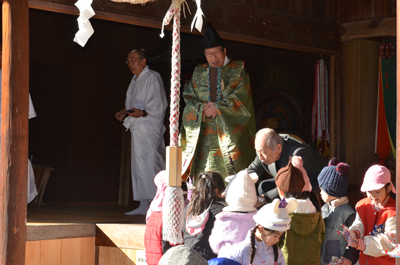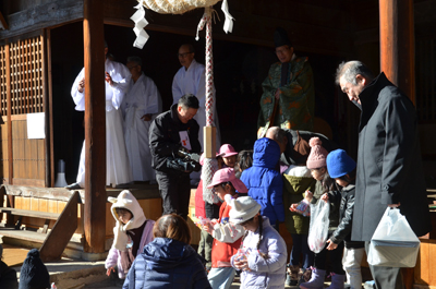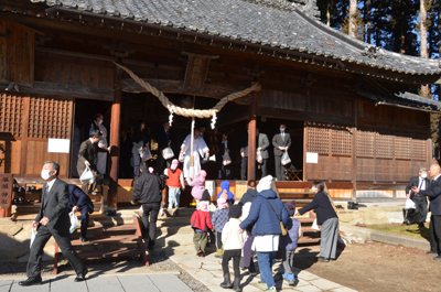 厳粛な神事が行われた後、境内では豆まきも行われ、豆まきには坂城保育園児も参加し、園児たちは袋いっぱいに詰まった豆やお菓子を嬉しそうに受け取っていました。